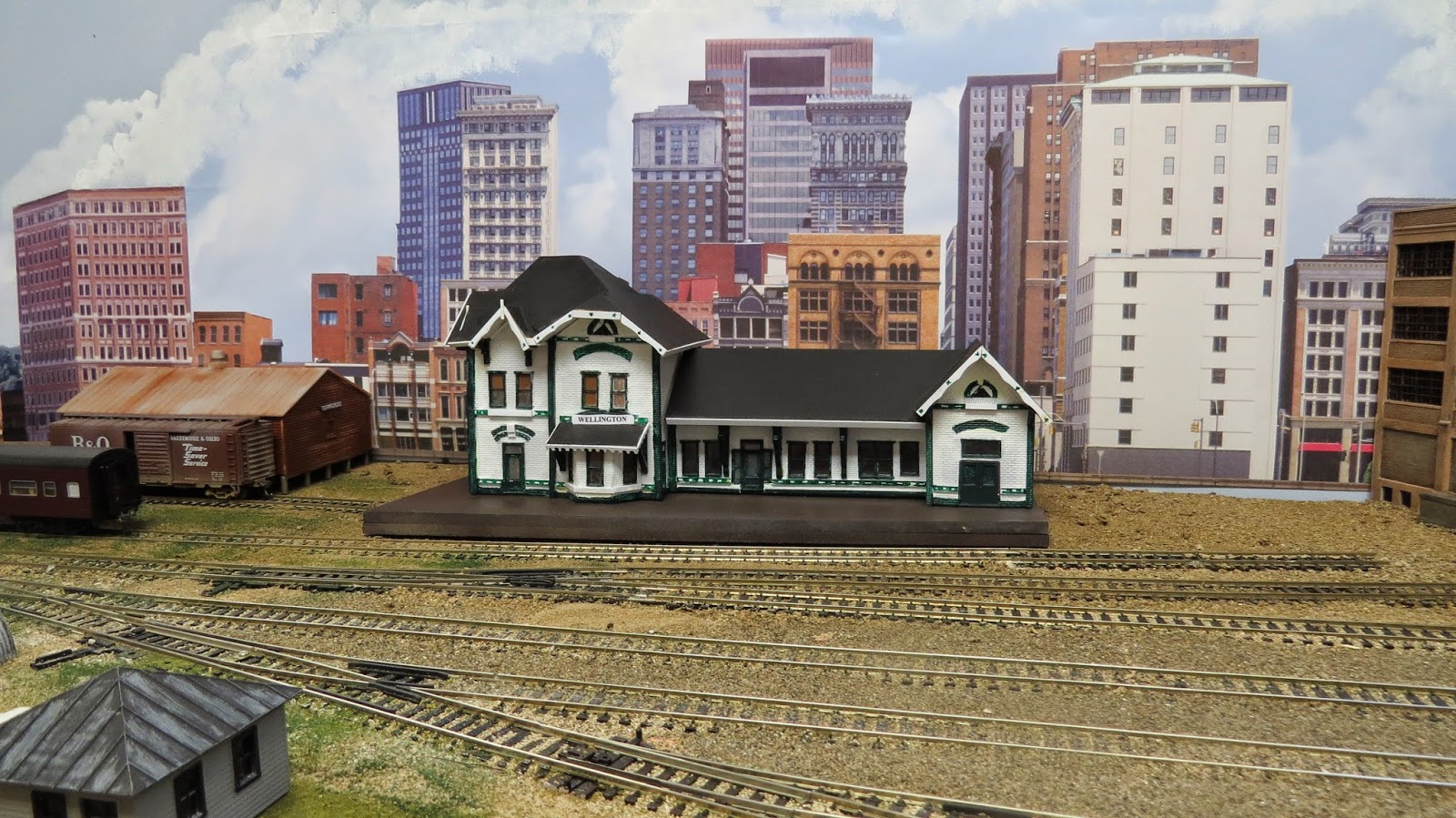 I was setting up a couple of trains before everyone else arrived when I found a lost box car hiding at Heritage Furniture, wonder how long it has been sitting there? The first 2 trains to run we're passenger trains. The picture below shows a meet at the Long River Bridge. Next a couple of freights started switching. As always, this is when problems pop up. We are still in the learning curve, where is such and such a place, sorry I forgot to put the switch back to the mainline, there is a hump in the track, my engine stops here all the time. Everyone needs to have a bright boy with them to clean the rails, if their engine stalls in one place. Please remember to put the switch back to the mainline. Next Tuesday is a work night, perhaps some of the track problems will be repaired. As the second picture shows, Jim ran his first switching train. What? Yes, it's true, this is a testament to how much people rely on him to program their engines and solve electronic problems, for which we are deeply indebted.